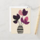 Rich plum petals rise in a cream-striped vase with thick outlines on a delicate yellow chiffon background—soft yet graphic.