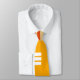 This tie has a mid-century modern abstract design of a gold circle inside a green circle with orange and white stripes.