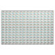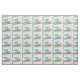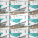 A mid-century modern abstract pattern fabric consisting of rectangles and triangles in colours of teal, brown and grey green on a white background.