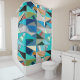 Shower curtain in a Mid-Century Modern abstract, geometric, composition in blue, turquoise, aqua and Earth neutrals, with grey and aqua predominating