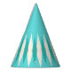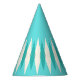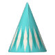 This Mid Century Modern Argyle Party Hat features a vibrant, turquoise background and a pattern of mod, translucent teal diamonds overlaying larger, vintage cream diamonds with gold coloured, space age speckles. This minimalist inspired, deconstructed argyle is a simplistic throwback of the larger than life atomic era that dominated the decorating landscape of the 1950s and 1960s. This kitschy design is reminiscent of everything from retro Palm Springs’ bowling alley signs to the television trays you used at your grandma’s house.
