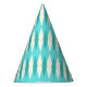 This Mid Century Modern Argyle Party Hat features a vibrant, turquoise background and a pattern of mod, translucent teal diamonds overlaying larger, vintage cream diamonds with gold coloured, space age speckles. This minimalist inspired, deconstructed argyle is a simplistic throwback of the larger than life atomic era that dominated the decorating landscape of the 1950s and 1960s. This kitschy design is reminiscent of everything from retro Palm Springs’ bowling alley signs to the television trays you used at your grandma’s house.