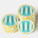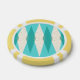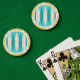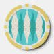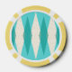 These Mid Century Modern Argyle Poker Chips feature a vibrant, turquoise background and a pattern of mod, translucent teal diamonds overlaying larger, vintage cream diamonds with gold colored, space age speckles. This minimalist inspired, deconstructed argyle is a simplistic throwback of the larger than life atomic era that dominated the decorating landscape of the 1950s and 1960s. This kitschy design is reminiscent of everything from retro Palm Springs’ bowling alley signs to the television trays you used at your grandma’s house.