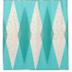 This Mid Century Modern Argyle Shower Curtain (vertical print) features a vibrant, turquoise background and a pattern of mod, translucent teal diamonds overlaying larger, vintage cream diamonds with gold coloured, space age speckles. This minimalist inspired, deconstructed argyle is a simplistic throwback of the larger than life atomic era that dominated the decorating landscape of the 1950s and 1960s. This kitschy design is reminiscent of everything from retro Palm Springs’ bowling alley signs to the television trays you used at your grandma’s house.