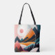Carry your belongings in style with our captivating abstract mid-century modern art tote bag. This stunning bag features a mesmerising depiction of mountains and a sunset, capturing the essence of natural beauty and wanderlust. With its spacious interior and sturdy construction, this tote bag is not only a fashionable accessory but also a practical companion for your daily adventures, allowing you to showcase your love for art wherever you go.
