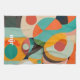 A Mid Century modern painting in various geometric shapes in red, teal, orange, black and green with bold white monogram or name.