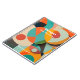 A Mid Century modern painting in various geometric shapes in red, teal, orange, black and green with bold white name or monogram with 2 extra text lines