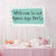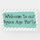 A 1960s space age theme with atomic stars, starburts and shapes. Colours include black, blue, pink, teal and yellow on a white background. Perfect for your next midcentury modern themed party.