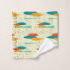 Mid-Century modern bathroom towel. Pointed oval lens shapes and eames pattern. Colours in red, turquoise, yellow and brown.