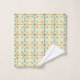 Mid-Century modern bathroom towel. Starburst pattern. Colours in red, yellow and turquoise.