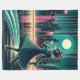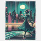 The colour palette of teal and pink, combined with pops of yellow from the building windows and white from the moon and pearls, creates a harmonious and visually appealing composition. This piece beautifully blends elegance with whimsy, capturing both sophistication through fashion elements and playful charm through the anthropomorphised cat character.