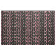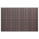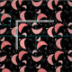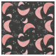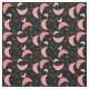 Mid-century modern boomerang pattern fabric. Boomerangs are salmon pink on a black background with rectangles and stars.