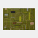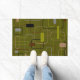 This doormat has a mid-century modern design of rectangles in green, gray, brown, and black.