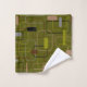 This towel set has a mid-century modern design of rectangles in green, grey, brown, and black.