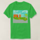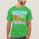 This Mid Century Modern Cartoon House T-Shirt will have you wanting to put out the WELCOME mat and make yourself at home! The 1960's, minimalist art design features a sleek, orange stone and aqua glass house on a lush, green, boomerang shaped lawn. The lawn forms an oasis in the middle of its grey, concrete surroundings. A green palm tree is swaying in the breeze. Four, orange stepping stones lead the way to the retro, red, front door with three, rectangular, glass window panes. To the left of the door, a turquoise flowerpot holds a tropical, green plant. The house has a sloping, V shaped white roof that is pointing towards two, white, kidney bean shaped clouds. The sky is a positively serene shade of aqua. No one will want to throw stones from this modern, glass house design! Buy this kitschy, space age product and be the coolest cat on your block!