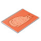 Notebook with a Mid-Century Modern, retro cat design, in a sputnik / starburst pattern - light coral orange with deep mandarin and white accents, outlined in dark orange, on a medium coral orange background