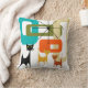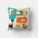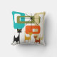 This throw pillow has a mid-century modern design of retro cats and rectangles in retro colours. Fun for cat enthusiasts!
