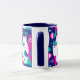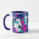 Mug in a mid-century modern-inspired design featuring two stylised cats in bold, geometric shapes of turquoise, magenta, dark blue, and white. Abstract patterns and retro shapes fill the background, giving it a fun, vintage vibe with a minimalist edge.