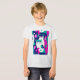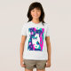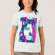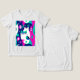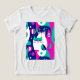 Shirt in a mid-century modern-inspired design featuring two stylised cats in bold, geometric shapes of turquoise, magenta, dark blue, and white. Abstract patterns and retro shapes fill the background, giving it a fun, vintage vibe with a minimalist edge.