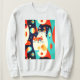 Sweatshirt in a mid-century modern-inspired design featuring two stylised cats in bold, geometric shapes of orange, teal, black, and white. Abstract patterns and retro shapes fill the background, giving it a fun, vintage vibe with a minimalist edge.