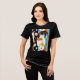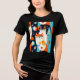 Tee in a mid-century modern-inspired design featuring two stylised cats in bold, geometric shapes of orange, teal, black, and white. Abstract patterns and retro shapes fill the background, giving it a fun, vintage vibe with a minimalist edge.