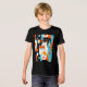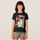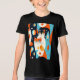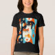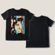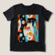 Shirt in a mid-century modern-inspired design featuring two stylised cats in bold, geometric shapes of orange, teal, black, and white. Abstract patterns and retro shapes fill the background, giving it a fun, vintage vibe with a minimalist edge.