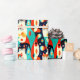 Wrapping paper in a mid-century modern-inspired design featuring two stylised cats in bold, geometric shapes of orange, teal, black, and white. Abstract patterns and retro shapes fill the background, giving it a fun, vintage vibe with a minimalist edge.