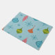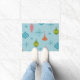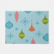 A mid century modern inspired Christmas design with colourful Christmas tree ornaments and sputnik starbursts, against a light blue background.