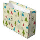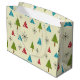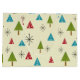 A vintage atomic era pattern with colourful green, blue and red Christmas trees with cool retro patterns, as well as sputnik starbursts.
