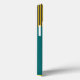 This phone case has a mid-century modern design of circles with lines coming out of them in teal and black on a field of gold.