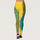 These leggings have a mid-century modern design of circles with lines coming out of them in teal and black on a field of gold.