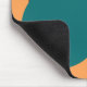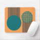 This mouse pad has a mid-century modern design of circles with lines coming out of them in teal and black on a field of orange.