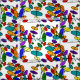 Mid-Century Modern fabric of colorful ovals and black curved lines. Ovals are primary colors and vibrant.
