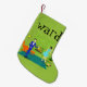 This Customisable Mid Century Modern Couple Christmas Stocking looks like a scene out of a romantic comedy. The 1960's style, minimalist art design features an attractive cartoon couple enjoying a romantic evening at home. The sophisticated room prominently features a green stone wall with a roaring fire in the fireplace. The furnishings in the room include an orange, lounge chair with matching footstool, a red, starburst wall clock, a yellow, sputnik light fixture, and an orange side table, which is home to a green, portable record player. On the floor beside the end table, a vinyl record can be seen poking out of a kitschy album cover. In the centre of the green flooring, there is a large, rectangular, teal rug. In the middle of the scene, we have a very sophisticated couple. There is a suave man in a royal blue suit, white shirt and blue bow tie. The tall, dark and handsome man is gazing at his lovely companion. The elegant, raven haired woman is wearing a flouncy aqua dress. They are each holding a crystal martini glass with a floating olive. Cheers! Here's to the perfect evening at home! Personalise with the name of the recipient. The opposite side of this stocking has a green, stone pattern.