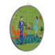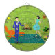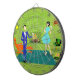 This Mid Century Modern Couple Dart Board looks like a scene out of a romantic comedy. The 1960's style, minimalist art design features an attractive cartoon couple enjoying a romantic evening at home. The sophisticated room prominently features a green stone wall with a roaring fire in the fireplace. The furnishings in the room include an orange, lounge chair with matching footstool, a red, starburst wall clock, a yellow, sputnik light fixture, and an orange side table, which is home to a green, portable record player. On the floor beside the end table, a vinyl record can be seen poking out of a kitschy album cover. In the centre of the green flooring, there is a large, rectangular, teal rug. In the middle of the scene, we have a very sophisticated couple. There is a suave man in a royal blue suit, white shirt and blue bow tie. The tall, dark and handsome man is gazing at his lovely companion. The elegant, raven haired woman is wearing a flouncy aqua dress. They are each holding a crystal martini glass with a floating olive. Cheers! Here's to the perfect evening at home!