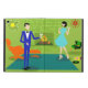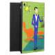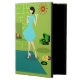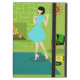 This Mid Century Modern Couple iPad Air Case looks like a scene out of a romantic comedy. The 1960's style, minimalist art design features an attractive cartoon couple enjoying a romantic evening at home. The sophisticated room prominently features a green stone wall with a roaring fire in the fireplace. The furnishings in the room include an orange, lounge chair with matching footstool, a red, starburst wall clock, a yellow, sputnik light fixture, and an orange side table, which is home to a green, portable record player. On the floor beside the end table, a vinyl record can be seen poking out of a kitschy album cover. In the centre of the green flooring, there is a large, rectangular, teal rug. In the middle of the scene, we have a very sophisticated couple. There is a suave man in a royal blue suit, white shirt and blue bow tie. The tall, dark and handsome man is gazing at his lovely companion. The elegant, raven haired woman is wearing a flouncy aqua dress. They are each holding a crystal martini glass with a floating olive. Cheers! Here's to the perfect evening at home!