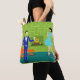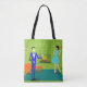This Mid Century Modern Couple All-Over Print Tote Bag looks like a scene out of a romantic comedy. The 1960's style, minimalist art design features an attractive cartoon couple enjoying a romantic evening at home. The sophisticated room prominently features a green stone wall with a roaring fire in the fireplace. The furnishings in the room include an orange, lounge chair with matching footstool, a red, starburst wall clock, a yellow, sputnik light fixture, and an orange side table, which is home to a green, portable record player. On the floor beside the end table, a vinyl record can be seen poking out of a kitschy album cover. In the centre of the green flooring, there is a large, rectangular, teal rug. In the middle of the scene, we have a very sophisticated couple. There is a suave man in a royal blue suit, white shirt and blue bow tie. The tall, dark and handsome man is gazing at his lovely companion. The elegant, raven haired woman is wearing a flouncy aqua dress. They are each holding a crystal martini glass with a floating olive. Cheers! Here's to the perfect evening at home!