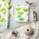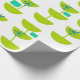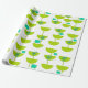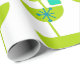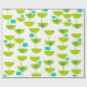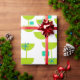 This wrapping paper has a Mid-century modern design of green half-circles that look like cups strung together with turquoise starbursts and rectangles.