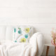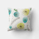 Mid-Century Modern Pillow dandelion clocks pillow in shades of yellow and blue with green leaves on a white, background. Back of pillow with coordinating design and signed by artist, Gail Gabel.