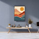 Evoke the serene beauty of a desert landscape with this mid-century modern inspired artwork. Abstract geological forms in warm terracotta, rust, and gold hues rise beneath a vibrant, oversized sun, while stylised waves of deep blue and teal introduce a surprising element of fluidity and calm. White linear details accentuate the contours of the mountains and waves, adding a sophisticated, minimalist touch. This piece captures the essence of a tranquil desert evening, blending earthy tones with a refreshing splash of cool blues, perfect for adding a touch of sophisticated calm to any contemporary space.