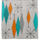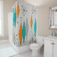 Mid-Century Modern Shower Curtain diamond and starburst pattern in teal, grey and orange on a light grey, textured 'look' background.