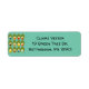 These return address labels have a mid-century modern design of green ovals with ovals and circles in them making them look like eggs in retro colours of red, yellow, blue, green, brown, and orange on a field of light blue.