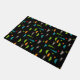 Mid-Century modern geometric abstract black doormat in colours of the time period on a black background.