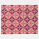 Retro mid mod geometric pattern of shapes in navy blue and aqua on a red coral background.