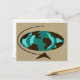 Travel around the world with this Mid Century Modern Globe Art Postcard. The front design features an abstract oval globe with wood grain continents. The oceans are in shades of teal and turquoise. The globe is on a triangular wooden stand and the whole world is on a wheat coloured background.