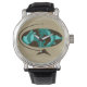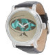 Travel around the world with this Mid Century Modern Globe Art Watch. The design features an abstract oval globe with wood grain continents. The oceans are in shades of teal and turquoise. The globe is on a triangular wooden stand and the whole world is on a wheat coloured background.