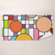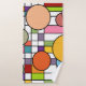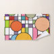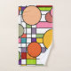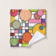 This towel set has a mid-century modern design of a grid with some rectangles coloured in and circles on top in retro colours.