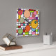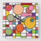 This wall clock has a mid-century modern design of a grid with some rectangles coloured in and circles on top in retro colours.