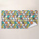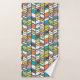 This towel set has a light blue washcloth, a gold hand towel, and a bath towel with a mid-century modern design of herringbone with retro colours and lines filling some of the spaces.