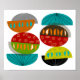Mid-Century Modern Art Poster half moons design in colours of red, orange and yellow, teal brown and black. . Colours relevant to the time period. Design is perfect for any mid-century modern home.